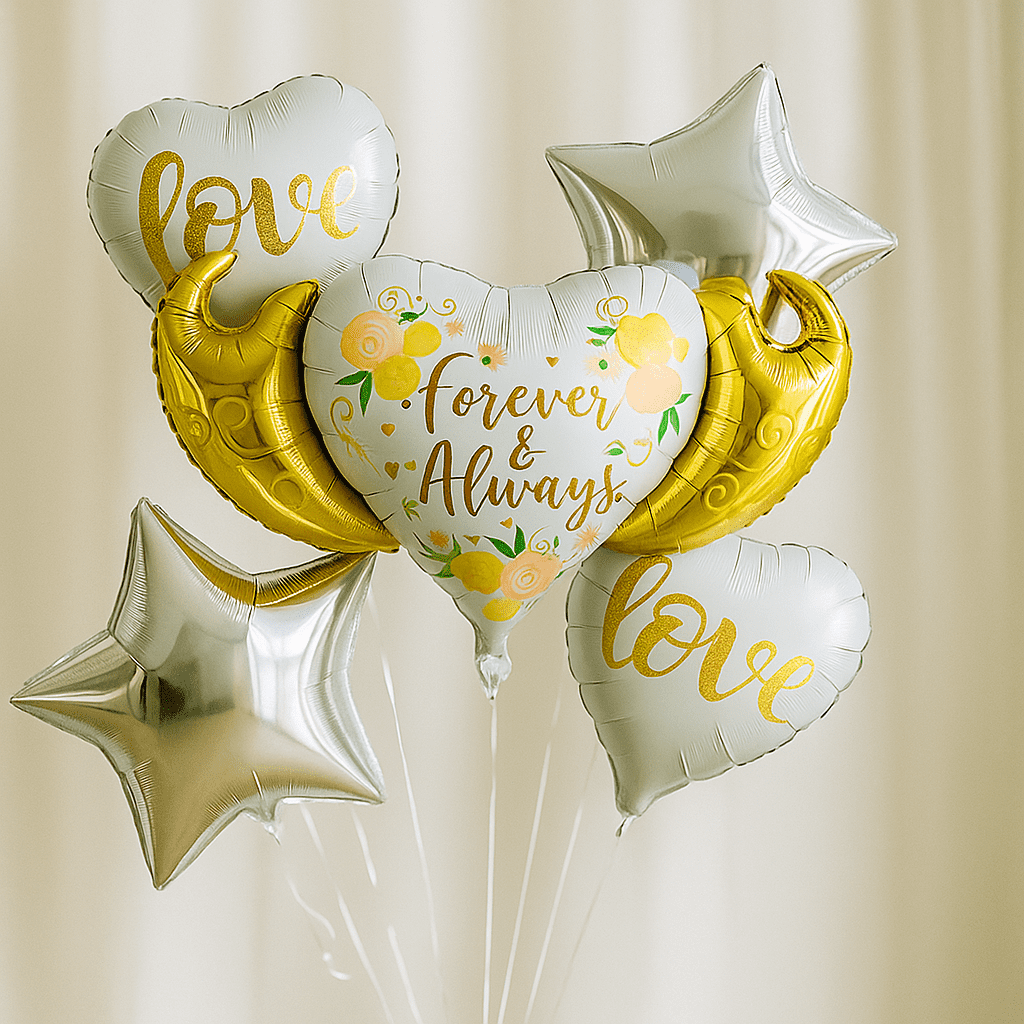 Celebrate your special anniversary with these festive foil mylar balloons. The set includes one Happy Anniversary Wings balloon, two white love balloons, and two silver balloons, all of which can be inflated with air or helium for a stunning display. These balloons are perfect for decorating your home or venue, adding a touch of elegance and romance to your anniversary celebration. Shipped deflated for convenience, these balloons are easy to set up and will create a memorable atmosphere for your special day.