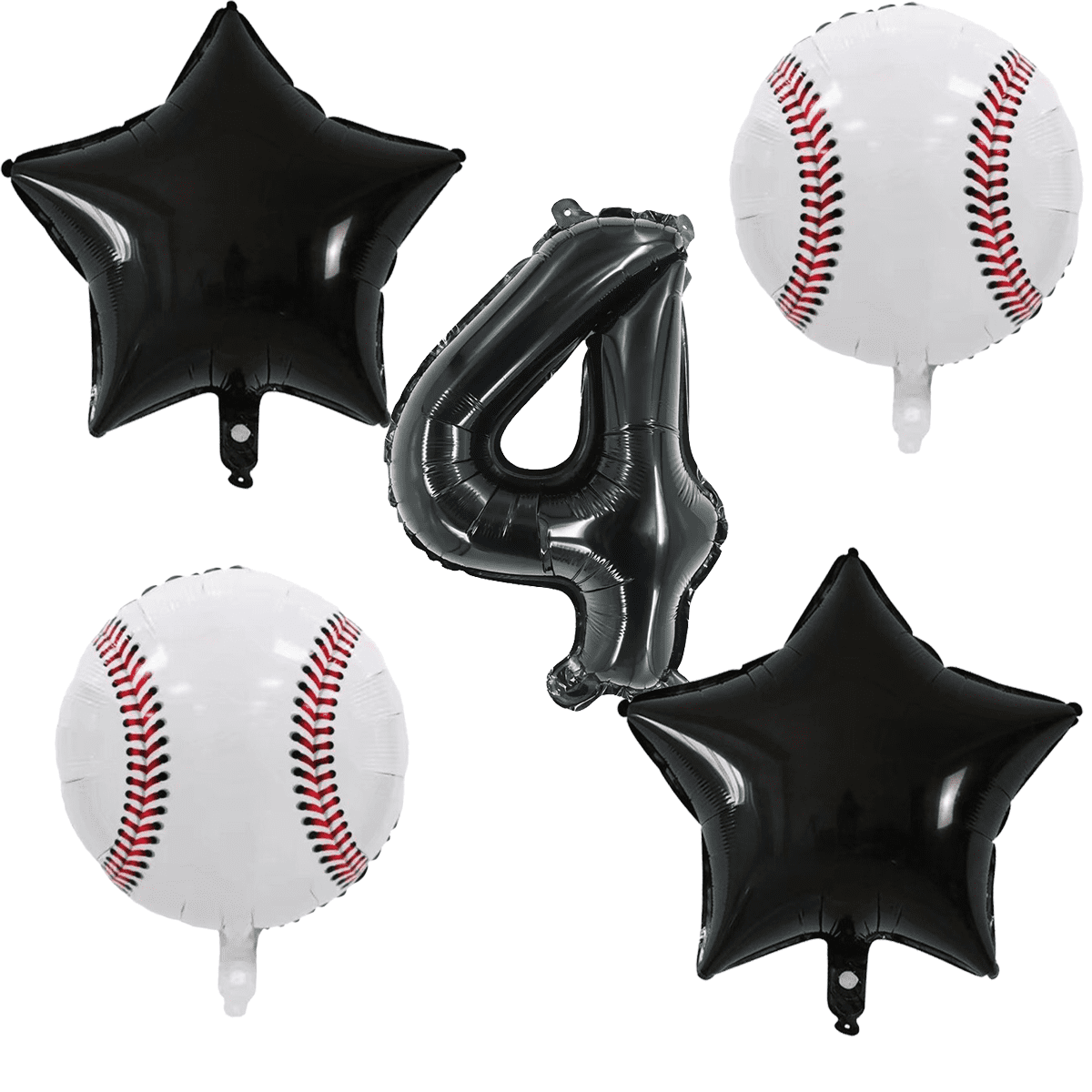 Celebrate your little slugger’s 4th birthday with our awesome Baseball 4th Birthday Party Balloons Kit Black White Number Foil Stars! This vibrant set features one large number 4 foil balloon, two baseball-themed foil balloons, and two black star foil balloons. These durable foil balloons are perfect for creating a fun and festive atmosphere. Each balloon is approximately 18 inches, making them a great size for a party centerpiece or backdrop for unforgettable photos. Ideal for fans of baseball, this set is a hit at any kids’ party! Use them to decorate your party space or give them as a memorable gift.