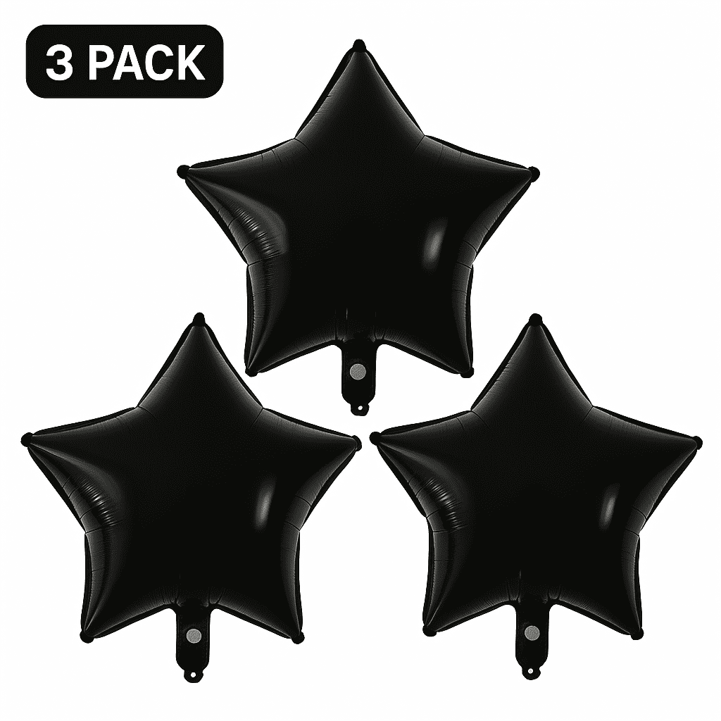 Add a touch of elegant mystery to your next celebration with this 3-pack of Black Star Foil Balloons! Perfect for birthdays, anniversaries, or any special event needing a sophisticated touch, these balloons are a simple yet stunning addition to any party. This Black Star Foil Balloons 3 Pack Party Decor set includes three large, durable foil star-shaped balloons, each measuring approximately 18 inches. Their rich, deep black color adds a dramatic flair to any setting. Use them as a centerpiece, a photo booth prop, or incorporate them into a balloon arch. These versatile balloons are sure to be a hit with guests of all ages!