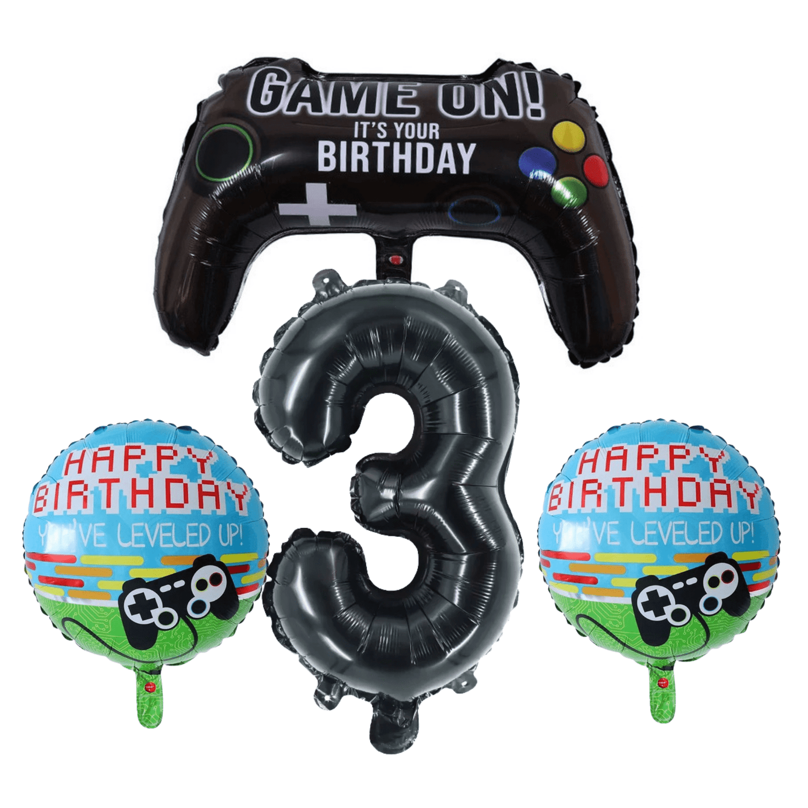 Level up your 3rd birthday party celebrations with this awesome Game Over birthday balloon kit! This vibrant set features a large number 3 foil balloon, a fun Game Controller foil balloon, and two coordinating “Happy Birthday†round balloons. The balloons are made of durable foil, featuring bright colors and cool video game designs. This Game Over 3rd Birthday Party Balloons Number 3 Kit Black Blue is perfect for a gamer’s 3rd birthday bash. Use them as a stunning party centerpiece, a fun photo booth backdrop, or a memorable gift—guaranteed to create an unforgettable gaming-themed atmosphere!