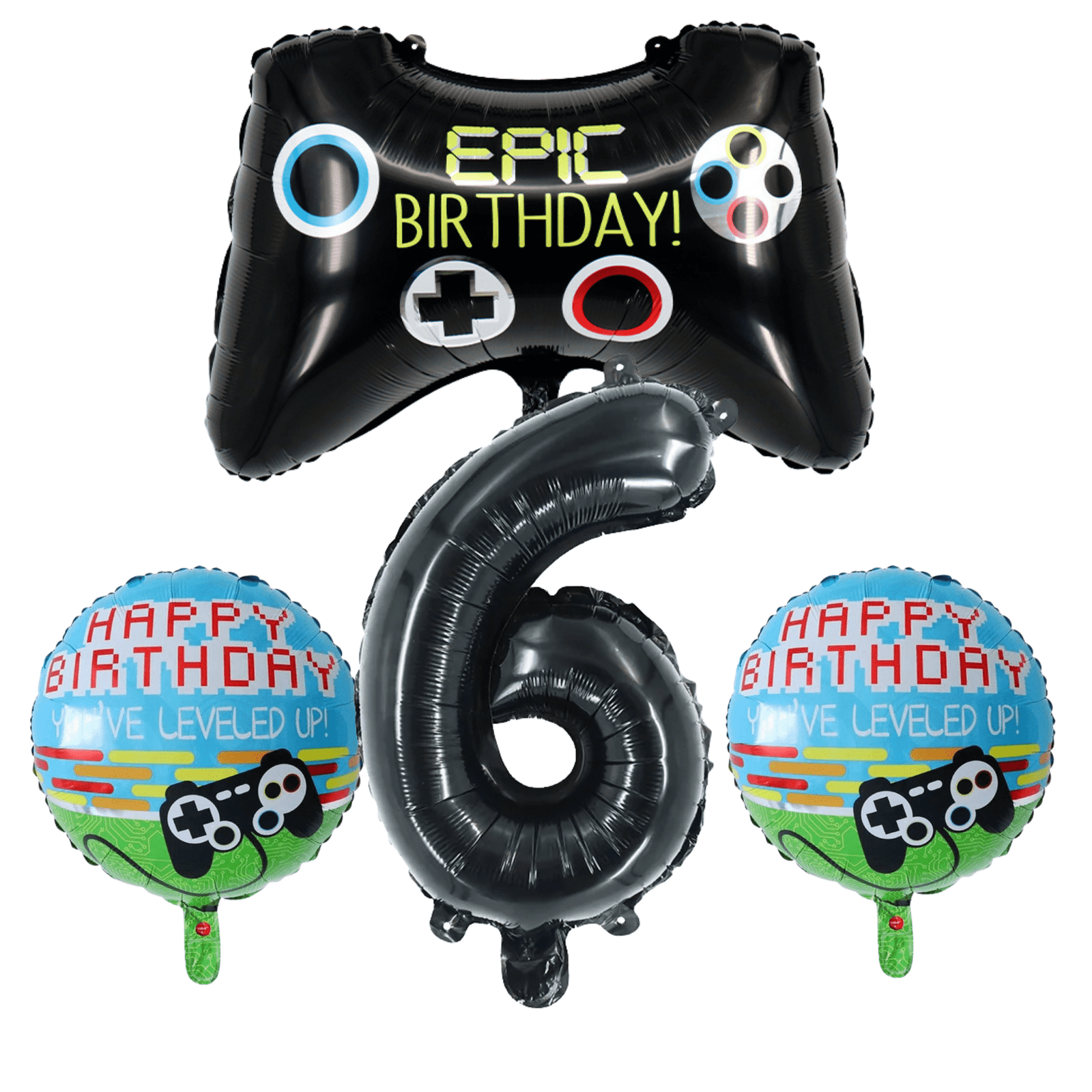 Level up your 6th birthday party celebrations with this epic Gamer Level Up 6th Birthday Party Foil Balloon Set! This vibrant set features a large black number 6 foil balloon, a fun video game controller foil balloon that exclaims “Epic Birthday!”, and two smaller round foil balloons with a fun “Happy Birthday, You’ve Leveled Up!” design. The balloons are made of durable, high-quality foil, and the bold black and colorful designs create a thrilling atmosphere. Perfect for a 6-year-old’s gaming-themed birthday, this set is ideal for fans of video games. Use these balloons as a stunning party centerpiece, a fun photo booth backdrop, or even a memorable gift—they’re guaranteed to make your celebration extra special!
