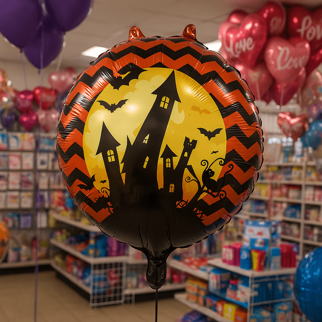 Creep into a spooky celebration with our Halloween Haunted House Foil Balloons! This 3-pack of Halloween Party Decor features three large, round foil balloons, each showcasing a whimsical haunted house scene against a chevron patterned background in black and orange. The durable foil balloons are perfect for adding a spooky touch to your Halloween party. These eye-catching balloons, measuring approximately 18 inches each, create a memorable atmosphere, ideal for photo ops and adding a spooky vibe to any room. Use them as a centerpiece, party decoration, or as a fun addition to your Halloween costume. Perfect for kids and adults alike.