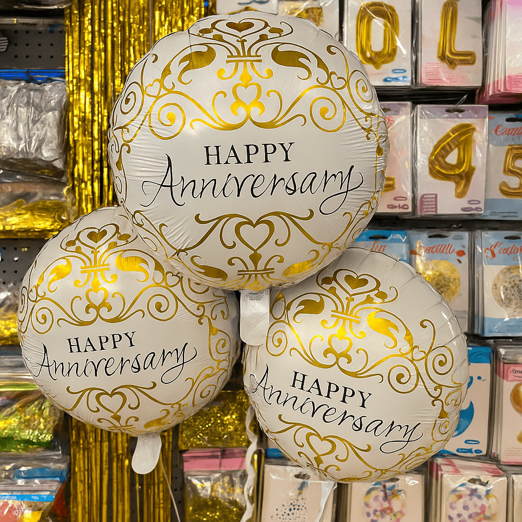 Celebrate love and lasting memories with our Happy Anniversary Mylar Balloon Set! This elegant 3-pack of foil balloons is perfect for adding a touch of sophistication to any anniversary celebration. Featuring a luxurious gold and white design with the message “Happy Anniversary,” these balloons are perfect for milestone events, wedding anniversaries, or romantic occasions. Made from high-quality mylar, these balloons are durable and long-lasting, suitable for both helium or air inflation.