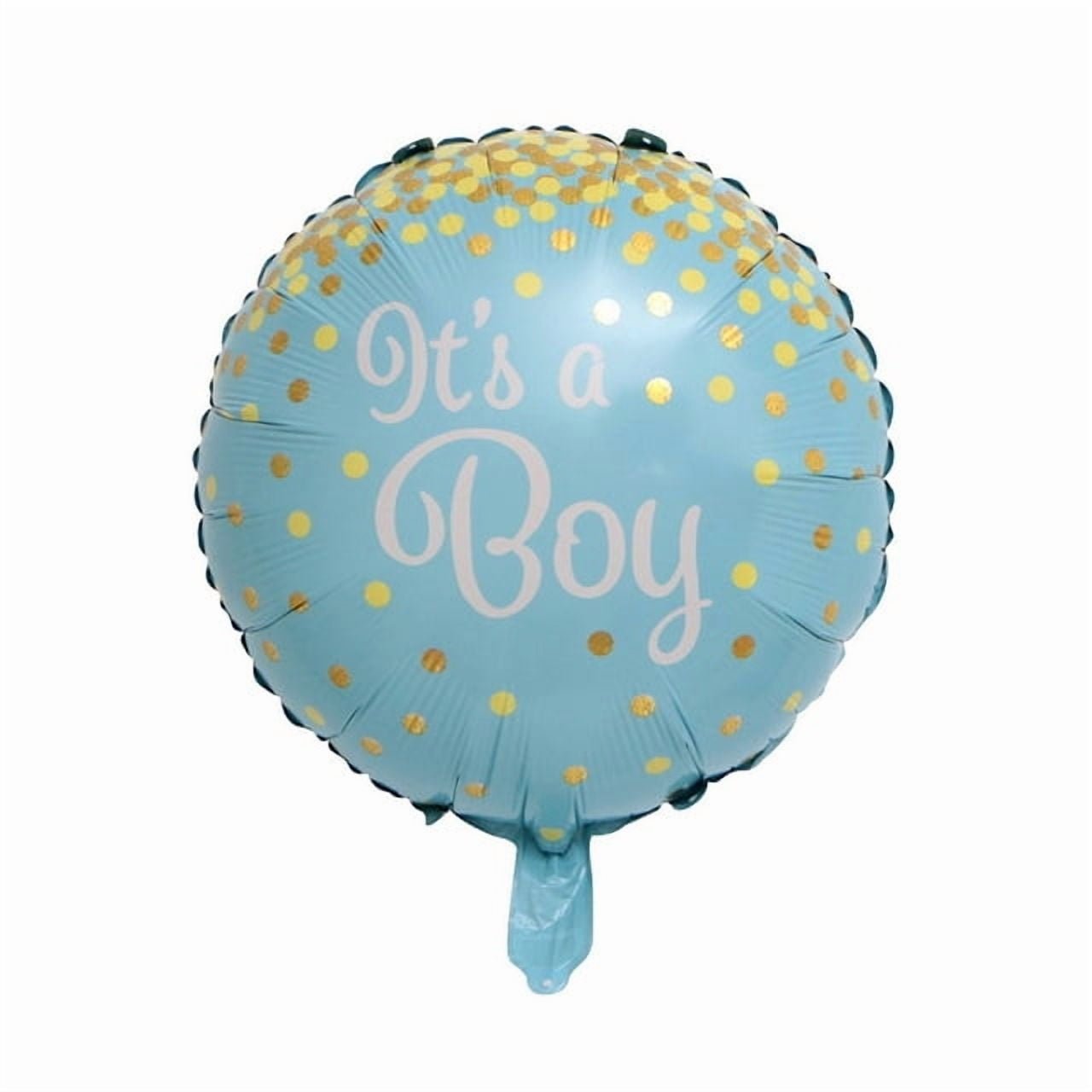 2 round blue balloons with “It’s a Boy” printed in elegant white script, complemented by a playful gold polka-dot design.