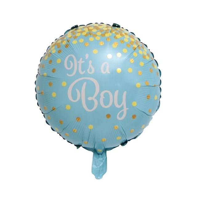 2 round blue foil balloons with “It’s a Boy” printed in stylish white letters, accented with cheerful gold polka dots.