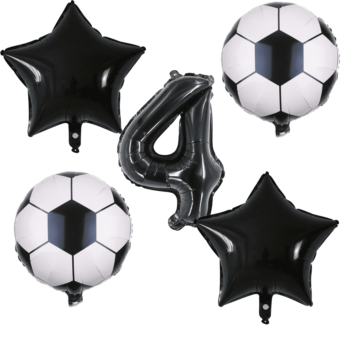 Goal! Celebrate your child’s 4th birthday with this amazing Soccer Theme 4th Birthday Party Foil Balloons Black White Number Stars set! This vibrant set features a large number 4 foil balloon, two fun soccer ball foil balloons, and two black star foil balloons, all perfect for creating a sporty and festive atmosphere. The durable foil balloons are easy to inflate and create a stunning centerpiece or photo booth backdrop. Each balloon is approximately 18 inches, creating a big impact. This set is ideal for any kid who loves soccer or for any 4th birthday party, guaranteeing a memorable celebration. Use them to decorate your party venue or give them as a fun gift!